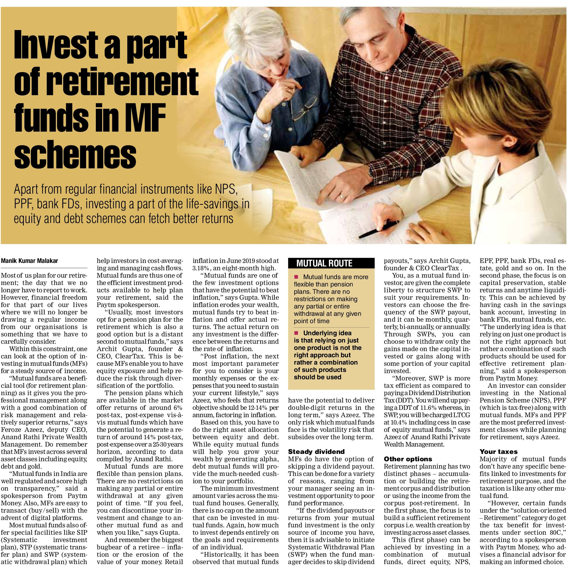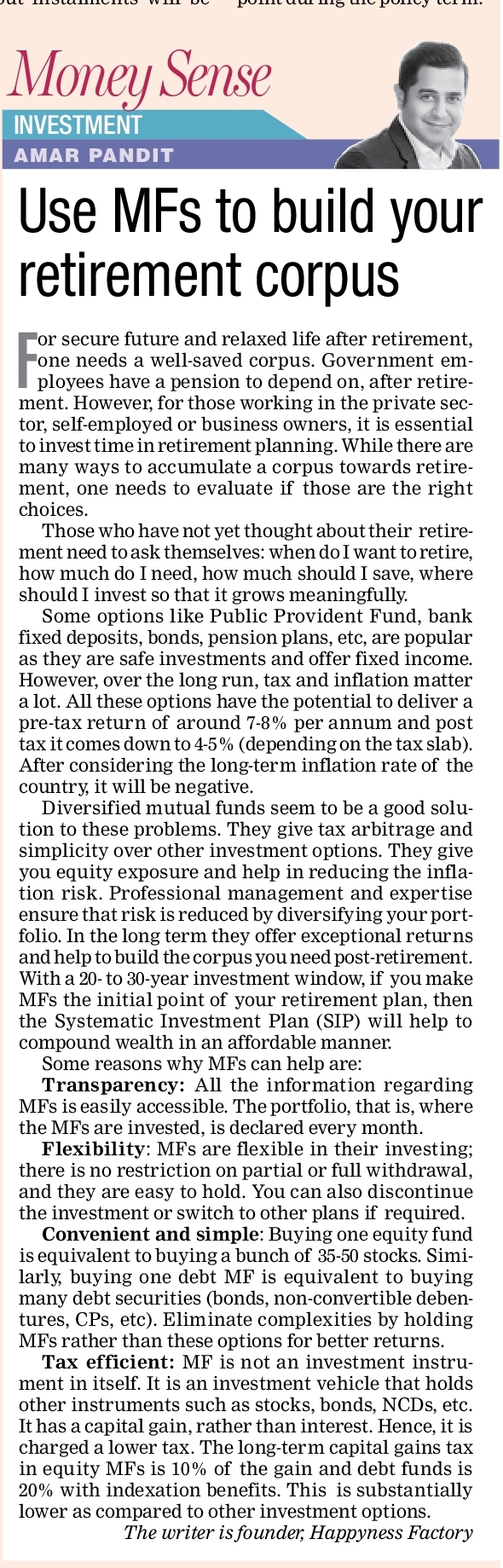 An individual can also invest in a debt of a hybrid mutual funds based on one’s risk appetite. Then for regular income, set up an SWP or systematic withdrawal plan which pays out a specific sum at regular intervals to the investor. If you have risk appetite and ample liquidity, you can also invest a portion in equity funds which will help beat inflation in the long run. Post retirement period need not be a short period. You must prepare for what if you outlive your expected life expectancy.