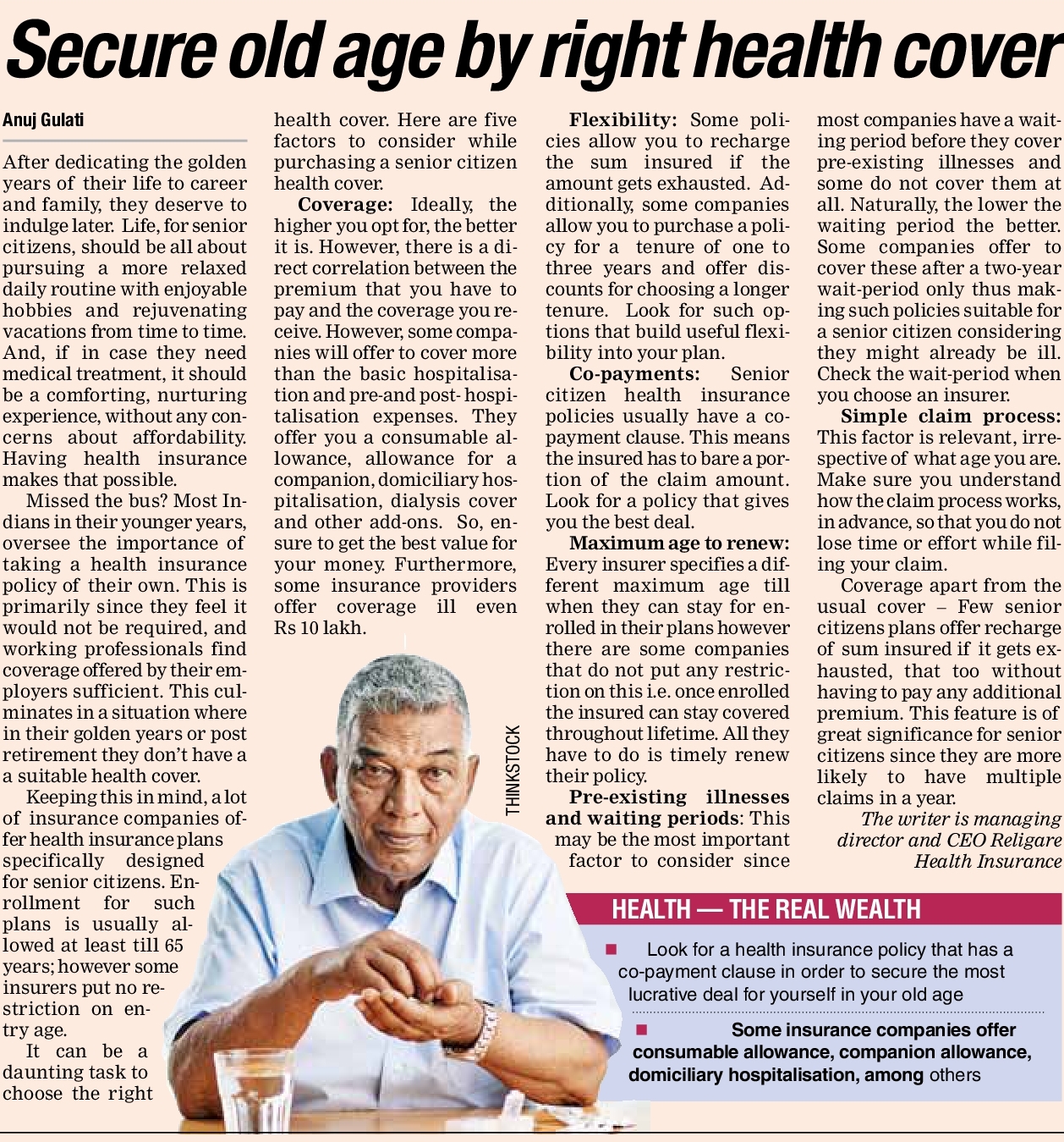 Before planning to invest, look for a senior citizen health insurance policy. Medical expenses tend to increase as you get older. It is crucial to cover yourself adequately for any medical emergencies. Senior citizen insurance plans usually have ’Co-pay’ clause and sub-limits. Co pay clause means where the insurer has to bear some part of the initial expenses. Insurer chips in only after a certain level of medical bill has been reached. You must understand the co-payment and sub limits thoroughly before buying a policy.