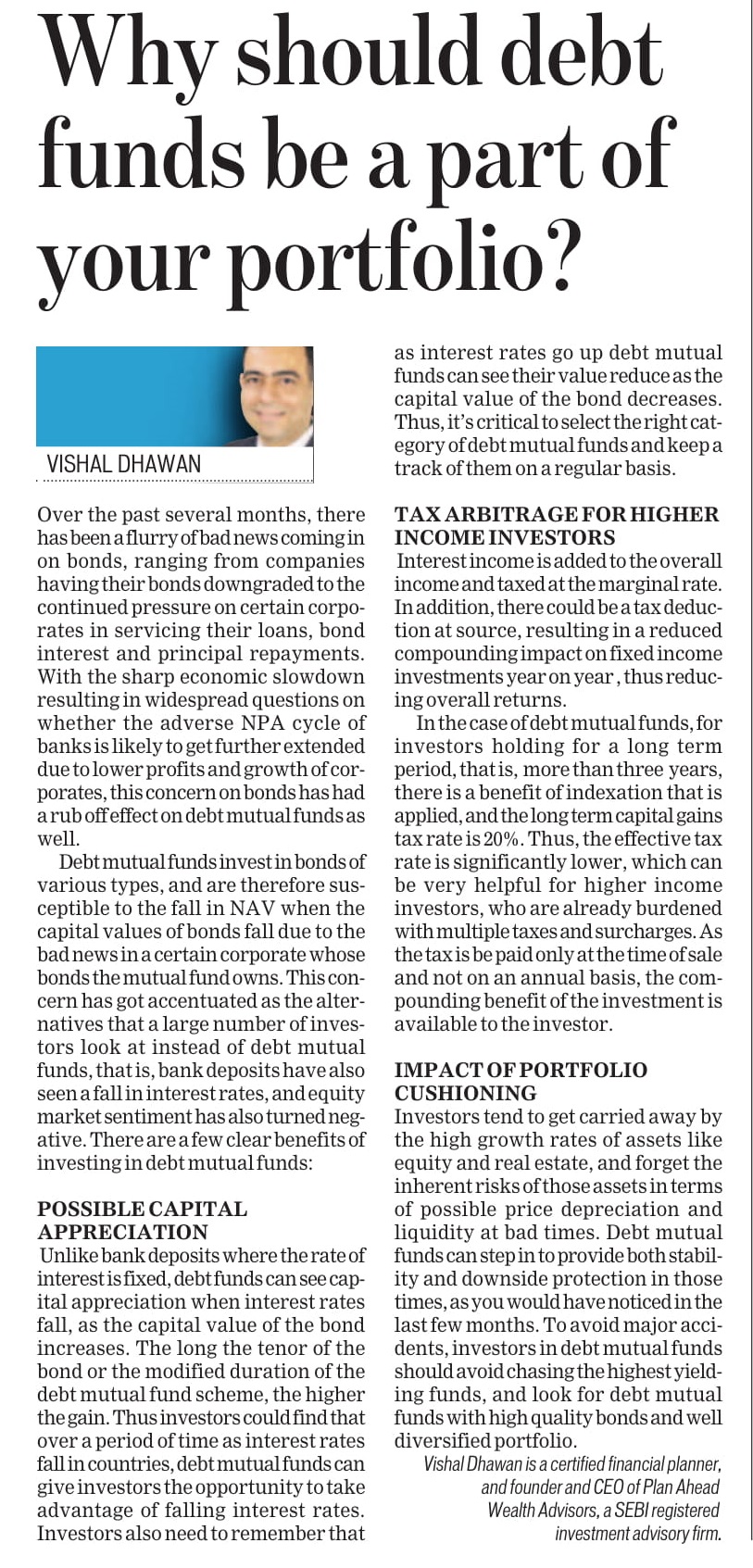 Risk Factors – Investments in Mutual Funds are subject to Market Risks. Read all scheme related documents carefully before investing. Mutual Fund Schemes do not assure or guarantee any returns. Past performances of any Mutual Fund Scheme may or may not be sustained in future. There is no guarantee that the investment objective of any suggested scheme shall be achieved. All existing and prospective investors are advised to check and evaluate the Exit loads and other cost structure (TER) applicable at the time of making the investment before finalizing on any investment decision for Mutual Funds schemes. We deal in Regular Plans only for Mutual Fund Schemes and earn a Trailing Commission on client investments. Disclosure For Commission earnings is made to clients at the time of investments. Option of Direct Plan for every Mutual Fund Scheme is available to investors offering advantage of lower expense ratio. We are not entitled to earn any commission on Direct plans. Hence we do not deal in Direct Plans.